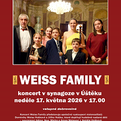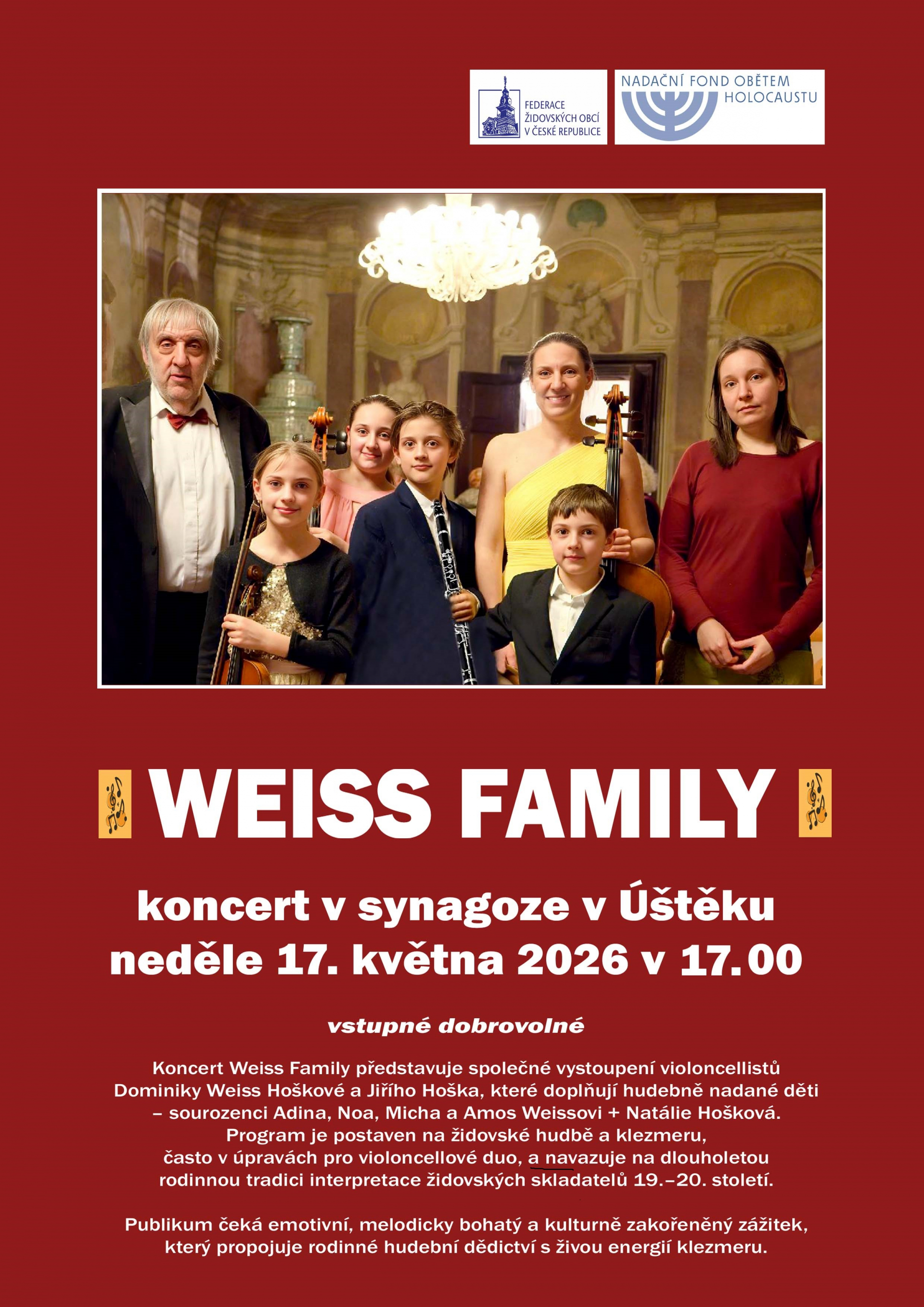 Společné vystoupení violoncellistů Jiřího Hoška, jeho dcery Dominiky Weiss Hoškové a dětí a sourozenců Adiny, Noaha, Michy, Amose a Natálie. Na programu je hudba židovských autorů a klezmerová muzika.